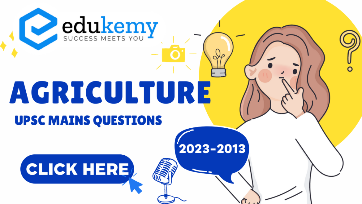 Subject-wise agriculture questions have been a prominent fixture in the UPSC Mains examination over the past decade, spanning from 2013 to 2023. These questions not only test the candidates’ understanding of agricultural concepts and practices but also gauge their ability to analyze and propose solutions to the multifaceted challenges facing the agricultural sector in India. From crop production techniques to agricultural policies, from agroecology to rural development schemes, the spectrum of topics covered is vast and varied. In this essay, we delve into the trends and patterns of agriculture-related questions in the UPSC Mains examinations during this period, highlighting the evolving focus areas and the significance of a comprehensive understanding of agriculture in the context of national development and food security.